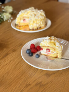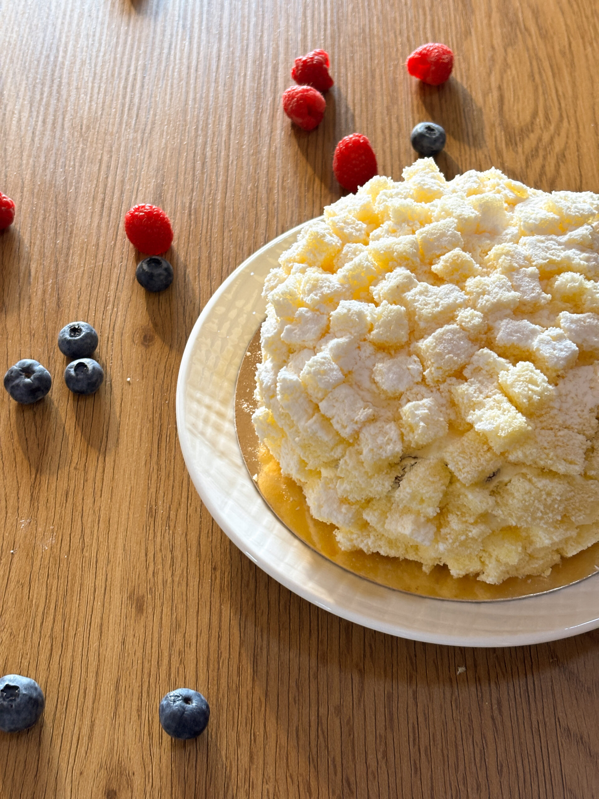 Soffice pan di Spagna, farcito con crema chantilly e frutti di bosco, ricoperto da una pioggia di morbidi cubetti di pan di Spagna che richiamano i fiori della mimosa.