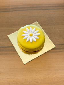 base di pan di Spagna al cacao farcito con confettura di lamponi e ricoperta da un sottile strato di cioccolato colorato di giallo, simbolo della giornata.