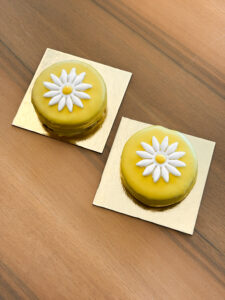 base di pan di Spagna al cacao farcito con confettura di lamponi e ricoperta da un sottile strato di cioccolato colorato di giallo, simbolo della giornata.