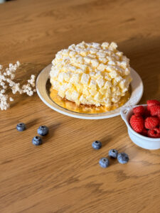 Soffice pan di Spagna, farcito con crema chantilly e frutti di bosco, ricoperto da una pioggia di morbidi cubetti di pan di Spagna che richiamano i fiori della mimosa.