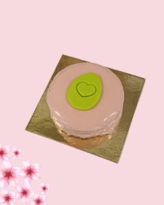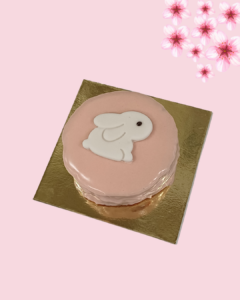 Novità 2026: monoporzione con base pandispagna al cacao farcita con marmellata di lamponi e ricoperta da un sottile strato di cioccolato rosa. Decorata a tema pasquale.